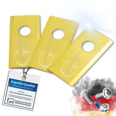 - Extra gehärtete Titan Messer von Genisys mit Sicherungslack-Schrauben. Bruchsicher durch die Umstellung auf auf die 1-Loch Variante