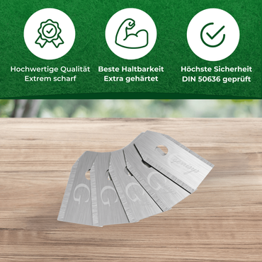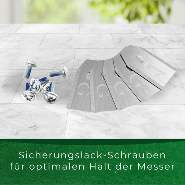 - Extra gehärteteMesser von Genisys mit Sicherungslack-Schrauben. Bruchsicher durch die Umstellung auf auf die 1-Loch Variante