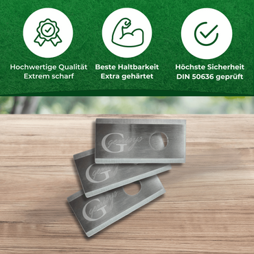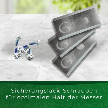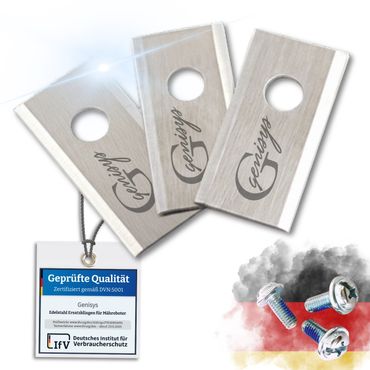- Extra gehärteteMesser von Genisys mit Sicherungslack-Schrauben. Bruchsicher durch die Umstellung auf auf die 1-Loch Variante