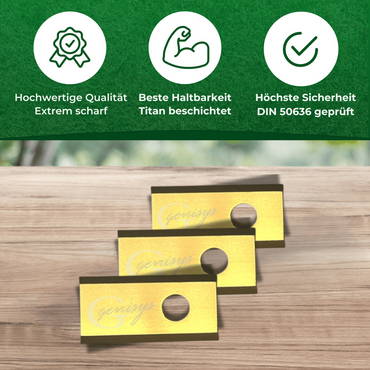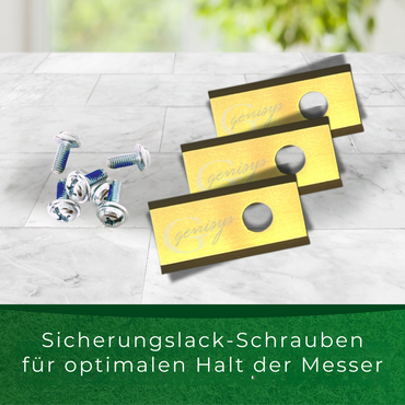 - Extra gehärtete Titan Messer von Genisys mit Sicherungslack-Schrauben. Bruchsicher durch die Umstellung auf auf die 1-Loch Variante